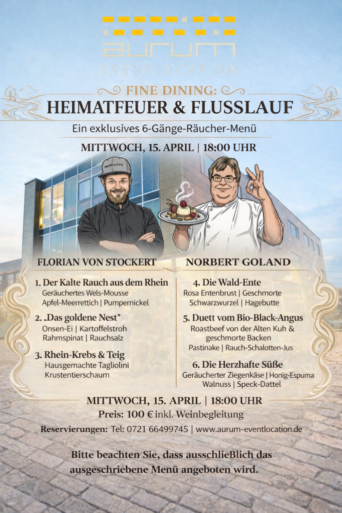 Termin: Mittwoch, 15.04.2026 | Beginn: 18:00 Uhr | Location: Aurum Eventlocation | Preis: 100 € pro Person (inkl. Weinbegleitung)